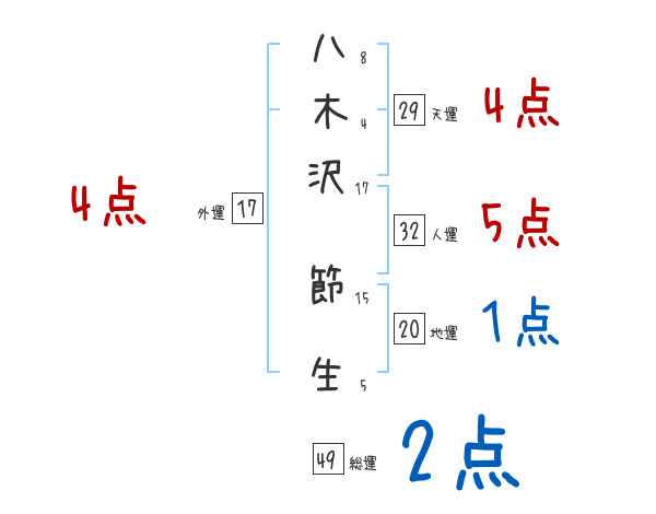 人運![]() | 八木沢節生さんの人運は32画の5つ星!柔軟性があり成功する。チャンスが多く金運が良い。 性格や才能などを表す2番目に重要な運勢です。人間関係や協調性、社会的な成功に影響します。主に20歳から50歳ぐらいまでの中年期の運勢を表します。 |