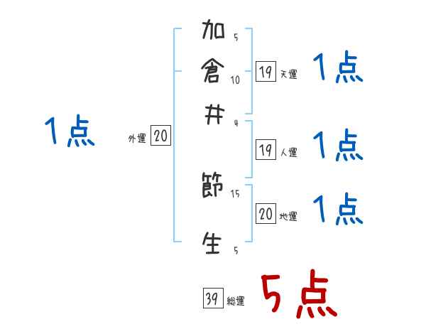 天運![]() | 加倉井節生さんの天運は19画の1つ星!優れた才能を持ちますが、協調性が足りないことも。周りの人と協力する事を意識しましょう。 家系が持つ宿命的な運勢を表します。祖先から受け継いだ苗字ですので自分の力が及びません。家柄を象徴します。 |