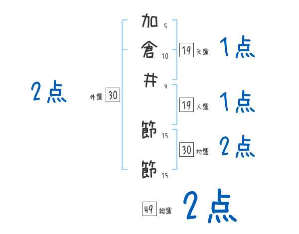 天運![]() | 加倉井節節さんの天運は19画の1つ星!優れた才能を持ちますが、協調性が足りないことも。周りの人と協力する事を意識しましょう。 家系が持つ宿命的な運勢を表します。祖先から受け継いだ苗字ですので自分の力が及びません。家柄を象徴します。 |