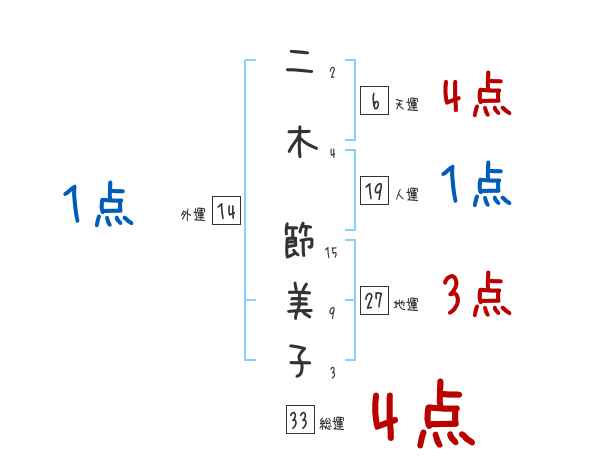 外運![]() | 二木節美子さんの外運は14画の1つ星!人に対して優しいがストレスを溜め込みがち。人間関係のトラブルを避けるよう気をつけましょう。 生活面を象徴する運勢です。外部から受ける影響力を表し、結婚運、家庭運や職場、環境への順応性を表します。 |