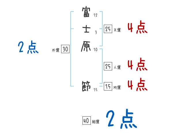 外運![]() | 富士原節さんの外運は30画の2つ星!浮き沈みの激しさに注意しましょう。 生活面を象徴する運勢です。外部から受ける影響力を表し、結婚運、家庭運や職場、環境への順応性を表します。 |