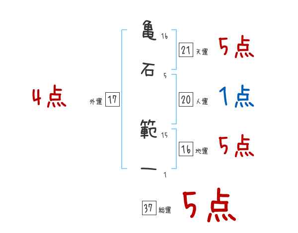 天運![]() | 亀石範一さんの天運は21画の5つ星!統率力がある。独立し成功する。名誉を手に入れる。 家系が持つ宿命的な運勢を表します。祖先から受け継いだ苗字ですので自分の力が及びません。家柄を象徴します。 |