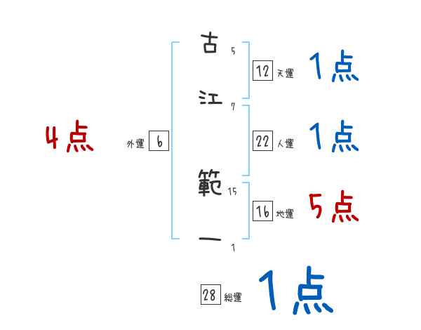 総運![]() | 古江範一さんの総運は28画の1つ星!家庭環境に注意。スポーツで活躍できる能力があるかも。 あなたの人生を表す1番重要な運勢です。生涯を通じて影響する総合運となり、主に50歳以降の晩年期に影響を及ぼします。 |