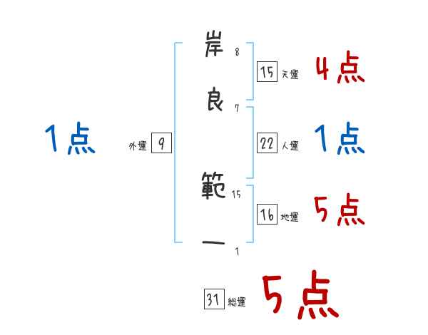 地運![]() | 岸良範一さんの地運は16画の5つ星!人望が厚く大きく発展する。逆転成功が見える。 個性を表す基礎的な運勢です。性格形成や対人関係、行動力など家庭環境に影響されます。主に誕生してから20歳くらいまでの若年期の運勢を表します。 |