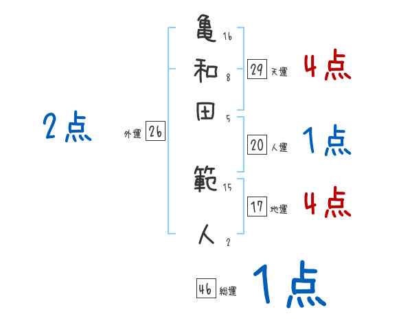 外運![]() | 亀和田範人さんの外運は26画の2つ星!波瀾万丈かも。信頼できる人を大事にしましょう。 生活面を象徴する運勢です。外部から受ける影響力を表し、結婚運、家庭運や職場、環境への順応性を表します。 |