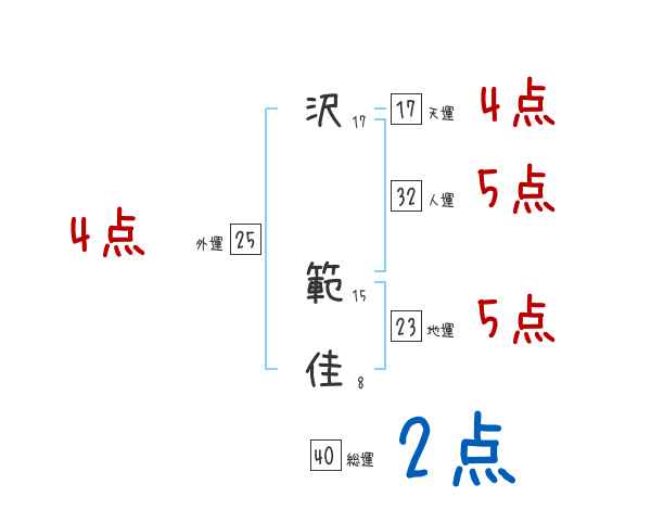 人運![]() | 沢範佳さんの人運は32画の5つ星!柔軟性があり成功する。チャンスが多く金運が良い。 性格や才能などを表す2番目に重要な運勢です。人間関係や協調性、社会的な成功に影響します。主に20歳から50歳ぐらいまでの中年期の運勢を表します。 |