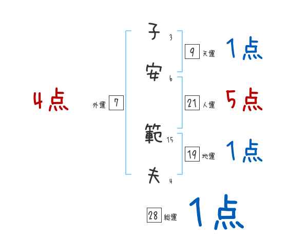 人運![]() | 子安範夫さんの人運は21画の5つ星!統率力がある。独立し成功する。名誉を手に入れる。 性格や才能などを表す2番目に重要な運勢です。人間関係や協調性、社会的な成功に影響します。主に20歳から50歳ぐらいまでの中年期の運勢を表します。 |