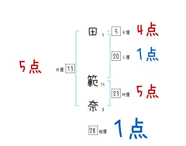天運![]() | 田範奈さんの天運は5画の4つ星!健康で安泰。協調性に優れ、財産に恵まれる。 家系が持つ宿命的な運勢を表します。祖先から受け継いだ苗字ですので自分の力が及びません。家柄を象徴します。 |