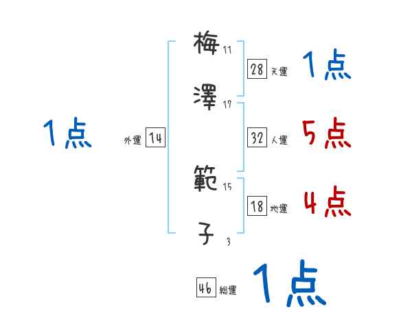 外運![]() | 梅澤範子さんの外運は14画の1つ星!人に対して優しいがストレスを溜め込みがち。人間関係のトラブルを避けるよう気をつけましょう。 生活面を象徴する運勢です。外部から受ける影響力を表し、結婚運、家庭運や職場、環境への順応性を表します。 |
