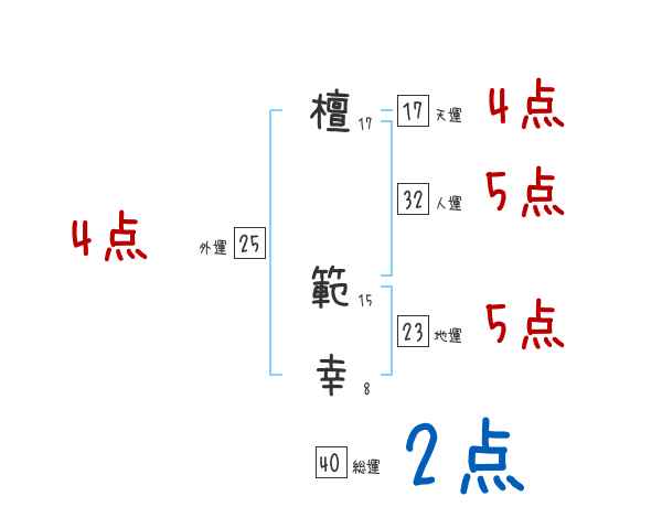 人運![]() | 檀範幸さんの人運は32画の5つ星!柔軟性があり成功する。チャンスが多く金運が良い。 性格や才能などを表す2番目に重要な運勢です。人間関係や協調性、社会的な成功に影響します。主に20歳から50歳ぐらいまでの中年期の運勢を表します。 |