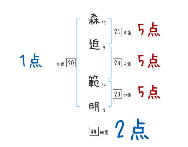 総運![]() | 森迫範明さんの総運は44画の2つ星!誠実で慎重な性格。物事を考えすぎないように注意しましょう。 あなたの人生を表す1番重要な運勢です。生涯を通じて影響する総合運となり、主に50歳以降の晩年期に影響を及ぼします。 |