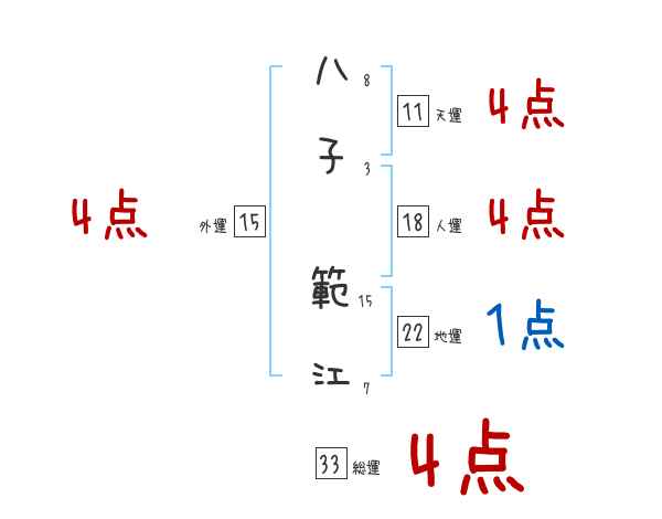 天運![]() | 八子範江さんの天運は11画の4つ星!着実に富や地位を得る幸運な人生。 家系が持つ宿命的な運勢を表します。祖先から受け継いだ苗字ですので自分の力が及びません。家柄を象徴します。 |