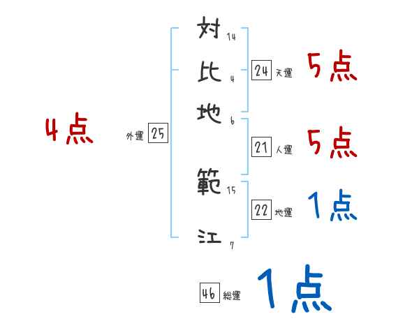 地運![]() | 対比地範江さんの地運は22画の1つ星!努力することが苦手ないっぽう手先が器用。芸術性にも優れる。 個性を表す基礎的な運勢です。性格形成や対人関係、行動力など家庭環境に影響されます。主に誕生してから20歳くらいまでの若年期の運勢を表します。 |