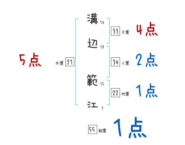 天運![]() | 溝辺範江さんの天運は33画の4つ星!権力志向でプライドが高い。勇気があり運を切り開き成功する。 家系が持つ宿命的な運勢を表します。祖先から受け継いだ苗字ですので自分の力が及びません。家柄を象徴します。 |
