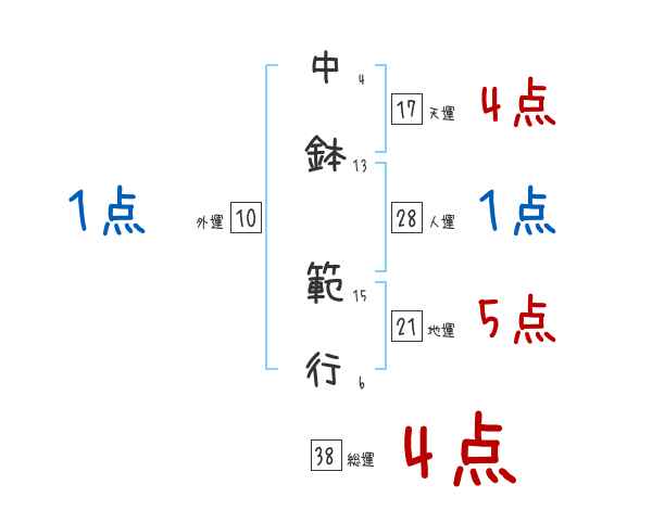 人運![]() | 中鉢範行さんの人運は28画の1つ星!家庭環境に注意。スポーツで活躍できる能力があるかも。 性格や才能などを表す2番目に重要な運勢です。人間関係や協調性、社会的な成功に影響します。主に20歳から50歳ぐらいまでの中年期の運勢を表します。 |
