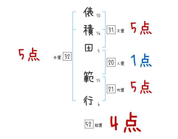 外運![]() | 俵積田範行さんの外運は32画の5つ星!柔軟性があり成功する。チャンスが多く金運が良い。 生活面を象徴する運勢です。外部から受ける影響力を表し、結婚運、家庭運や職場、環境への順応性を表します。 |