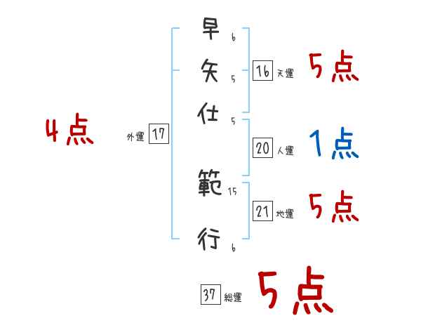 外運![]() | 早矢仕範行さんの外運は17画の4つ星!積極的な行動力。地位を気づき財産を手に入れる。純粋な心と直感力。 生活面を象徴する運勢です。外部から受ける影響力を表し、結婚運、家庭運や職場、環境への順応性を表します。 |