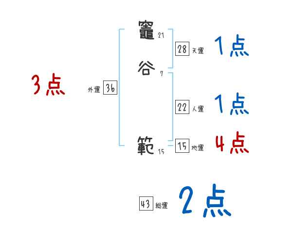 総運![]() | 竈谷範さんの総運は43画の2つ星!頑固な性格で独立心が強いかも。やや非現実的で浪費に注意しましょう。 あなたの人生を表す1番重要な運勢です。生涯を通じて影響する総合運となり、主に50歳以降の晩年期に影響を及ぼします。 |