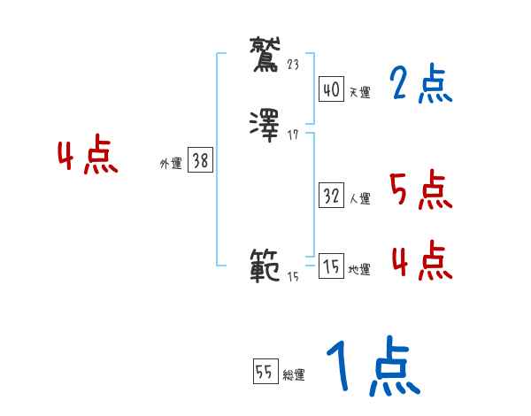人運![]() | 鷲澤範さんの人運は32画の5つ星!柔軟性があり成功する。チャンスが多く金運が良い。 性格や才能などを表す2番目に重要な運勢です。人間関係や協調性、社会的な成功に影響します。主に20歳から50歳ぐらいまでの中年期の運勢を表します。 |