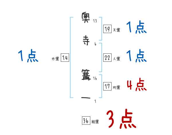 外運![]() | 奥寺篝一さんの外運は14画の1つ星!人に対して優しいがストレスを溜め込みがち。人間関係のトラブルを避けるよう気をつけましょう。 生活面を象徴する運勢です。外部から受ける影響力を表し、結婚運、家庭運や職場、環境への順応性を表します。 |