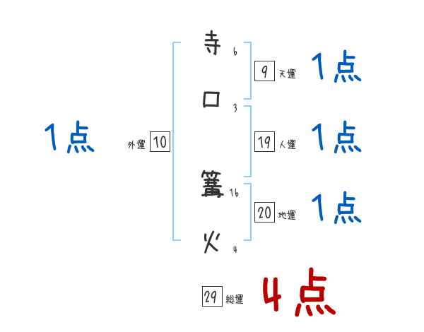 総運![]() | 寺口篝火さんの総運は29画の4つ星!完全主義で才能がある。厳格な心の持ち主。 あなたの人生を表す1番重要な運勢です。生涯を通じて影響する総合運となり、主に50歳以降の晩年期に影響を及ぼします。 |