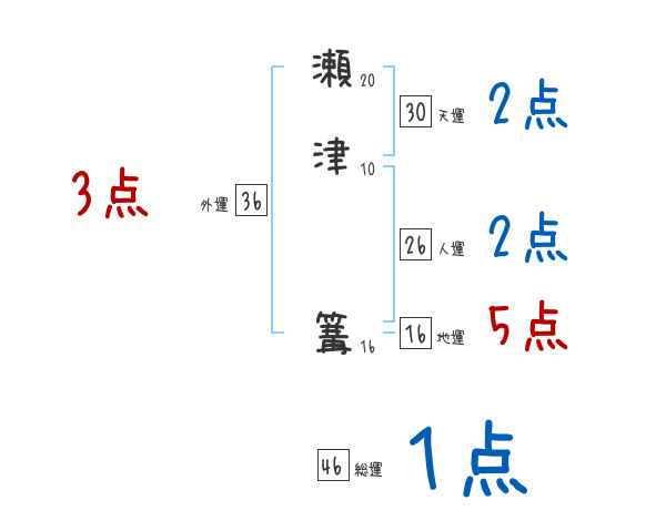 総運![]() | 瀬津篝さんの総運は46画の1つ星!迷走することが多く苦労するかも。目先のことにとらわれないように。 あなたの人生を表す1番重要な運勢です。生涯を通じて影響する総合運となり、主に50歳以降の晩年期に影響を及ぼします。 |