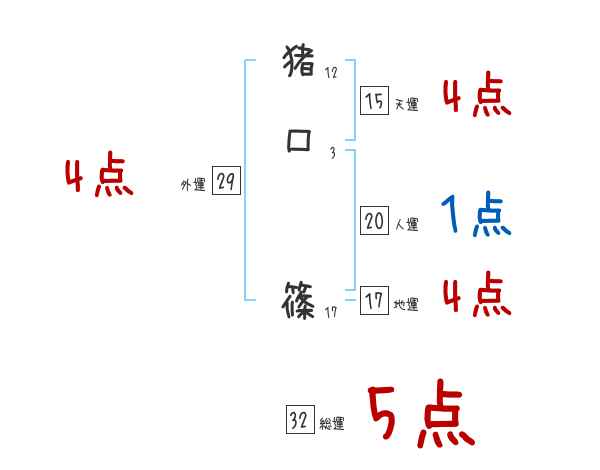 総運![]() | 猪口篠さんの総運は32画の5つ星!柔軟性があり成功する。チャンスが多く金運が良い。 あなたの人生を表す1番重要な運勢です。生涯を通じて影響する総合運となり、主に50歳以降の晩年期に影響を及ぼします。 |