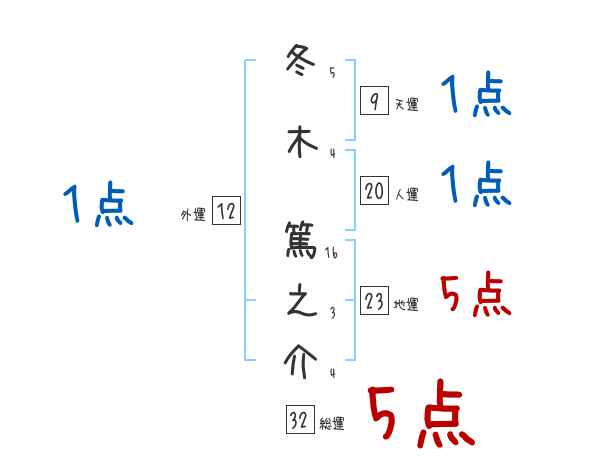 総運![]() | 冬木篤之介さんの総運は32画の5つ星!柔軟性があり成功する。チャンスが多く金運が良い。 あなたの人生を表す1番重要な運勢です。生涯を通じて影響する総合運となり、主に50歳以降の晩年期に影響を及ぼします。 |