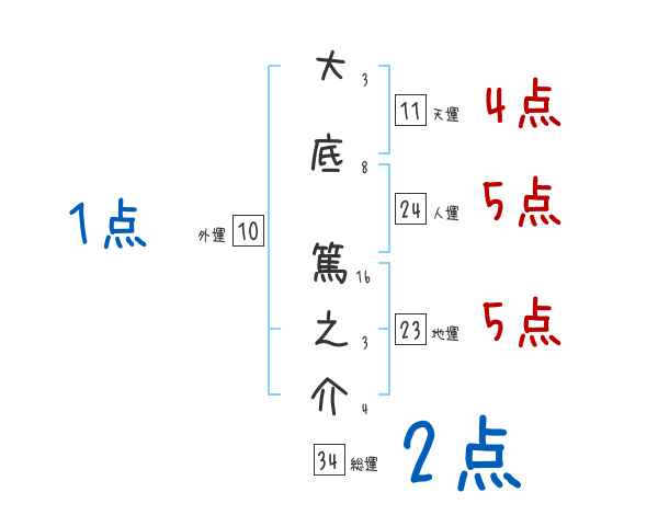 総運![]() | 大底篤之介さんの総運は34画の2つ星!独創性に優れるが、自尊心が強く災難に注意しましょう。 あなたの人生を表す1番重要な運勢です。生涯を通じて影響する総合運となり、主に50歳以降の晩年期に影響を及ぼします。 |