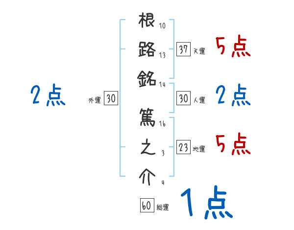 外運![]() | 根路銘篤之介さんの外運は30画の2つ星!浮き沈みの激しさに注意しましょう。 生活面を象徴する運勢です。外部から受ける影響力を表し、結婚運、家庭運や職場、環境への順応性を表します。 |