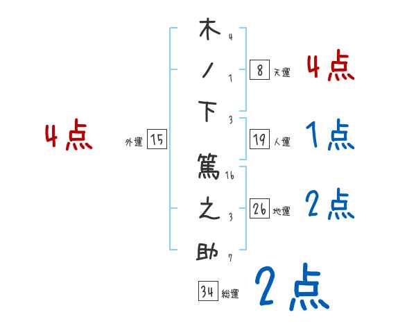 外運![]() | 木ノ下篤之助さんの外運は15画の4つ星!人徳があり出世する。順調に物事を進め円満な人生。 生活面を象徴する運勢です。外部から受ける影響力を表し、結婚運、家庭運や職場、環境への順応性を表します。 |