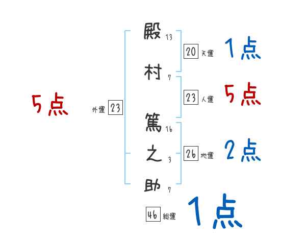 外運![]() | 殿村篤之助さんの外運は23画の5つ星!想像力に優れ活力がある。一代で成功し名誉を手に入れる。 生活面を象徴する運勢です。外部から受ける影響力を表し、結婚運、家庭運や職場、環境への順応性を表します。 |
