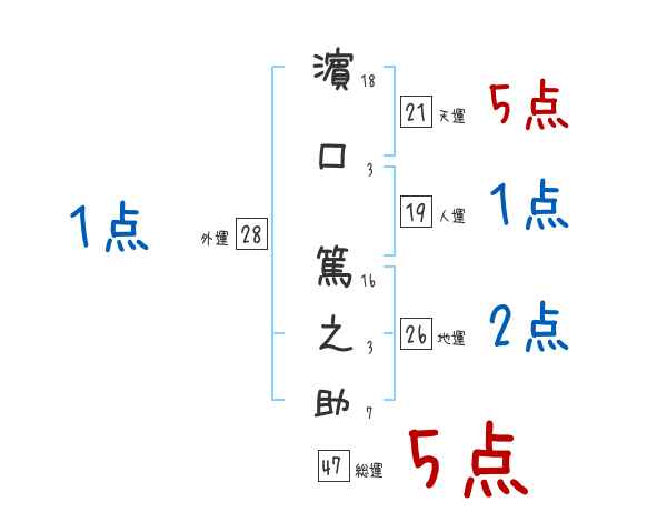 天運![]() | 濵口篤之助さんの天運は21画の5つ星!統率力がある。独立し成功する。名誉を手に入れる。 家系が持つ宿命的な運勢を表します。祖先から受け継いだ苗字ですので自分の力が及びません。家柄を象徴します。 |
