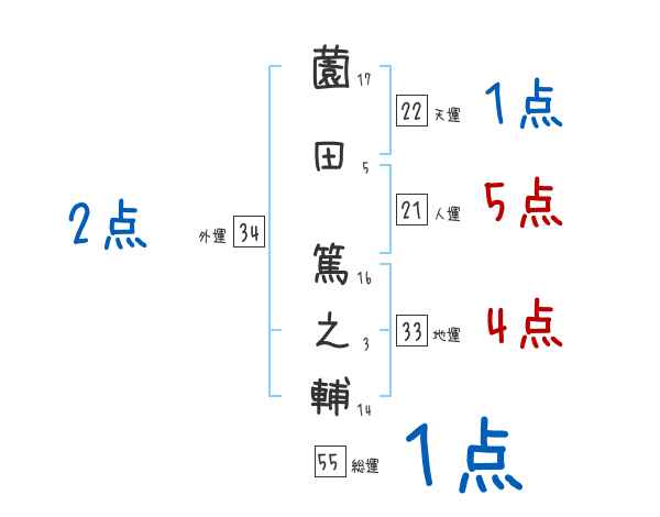 | 人運  | 薗田篤之輔さんの人運は21画の5つ星!統率力がある。独立し成功する。名誉を手に入れる。性格や才能などを表す2番目に重要な運勢です。人間関係や協調性、社会的な成功に影響します。主に20歳から50歳ぐらいまでの中年期の運勢を表します。 |