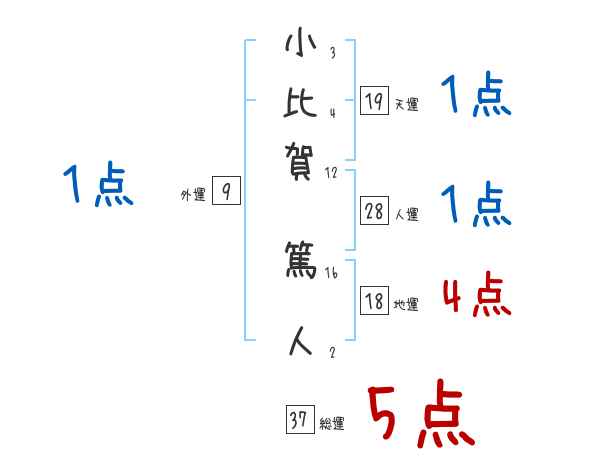 人運![]() | 小比賀篤人さんの人運は28画の1つ星!家庭環境に注意。スポーツで活躍できる能力があるかも。 性格や才能などを表す2番目に重要な運勢です。人間関係や協調性、社会的な成功に影響します。主に20歳から50歳ぐらいまでの中年期の運勢を表します。 |