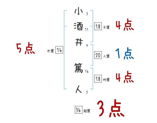 天運![]() | 小酒井篤人さんの天運は18画の4つ星!情熱的で剛気。忍耐力があり信頼される。 家系が持つ宿命的な運勢を表します。祖先から受け継いだ苗字ですので自分の力が及びません。家柄を象徴します。 |