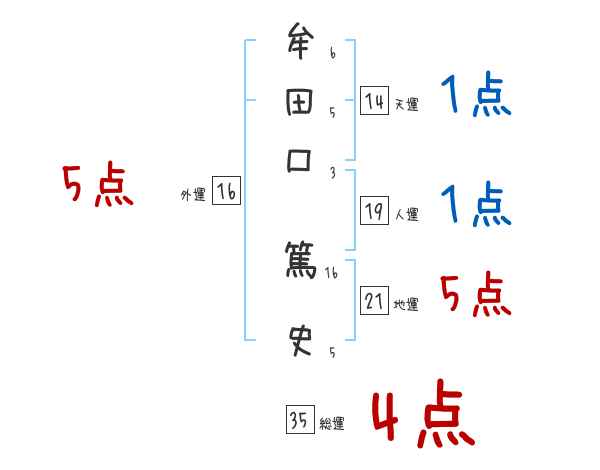外運![]() | 牟田口篤史さんの外運は16画の5つ星!人望が厚く大きく発展する。逆転成功が見える。 生活面を象徴する運勢です。外部から受ける影響力を表し、結婚運、家庭運や職場、環境への順応性を表します。 |