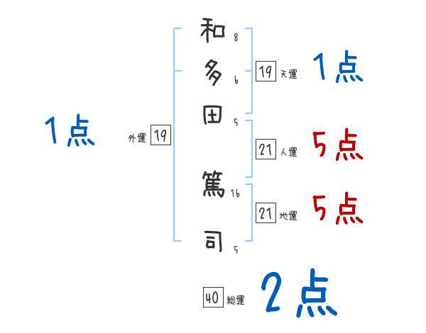 外運![]() | 和多田篤司さんの外運は19画の1つ星!優れた才能を持ちますが、協調性が足りないことも。周りの人と協力する事を意識しましょう。 生活面を象徴する運勢です。外部から受ける影響力を表し、結婚運、家庭運や職場、環境への順応性を表します。 |