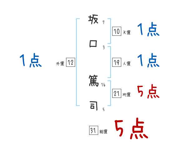 天運![]() | 坂口篤司さんの天運は10画の1つ星!不安を感じやすい傾向。ストレスを抱えないように注意しましょう。 家系が持つ宿命的な運勢を表します。祖先から受け継いだ苗字ですので自分の力が及びません。家柄を象徴します。 |