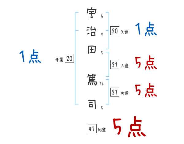 総運![]() | 宇治田篤司さんの総運は41画の5つ星!大志を抱き、目標に向かって実力を発揮し達成する。温和な性格。 あなたの人生を表す1番重要な運勢です。生涯を通じて影響する総合運となり、主に50歳以降の晩年期に影響を及ぼします。 |