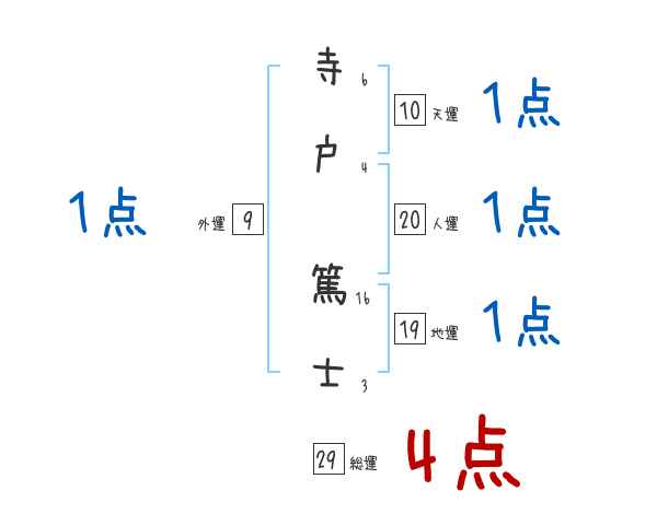 総運![]() | 寺戸篤士さんの総運は29画の4つ星!完全主義で才能がある。厳格な心の持ち主。 あなたの人生を表す1番重要な運勢です。生涯を通じて影響する総合運となり、主に50歳以降の晩年期に影響を及ぼします。 |
