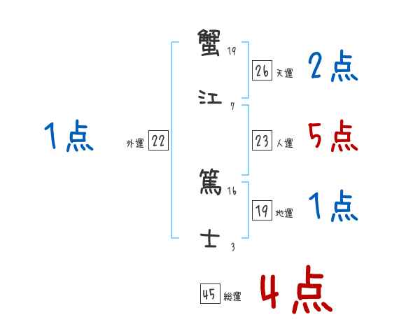 人運![]() | 蟹江篤士さんの人運は23画の5つ星!想像力に優れ活力がある。一代で成功し名誉を手に入れる。 性格や才能などを表す2番目に重要な運勢です。人間関係や協調性、社会的な成功に影響します。主に20歳から50歳ぐらいまでの中年期の運勢を表します。 |