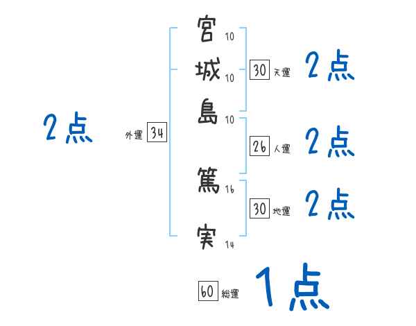天運![]() | 宮城島篤実さんの天運は30画の2つ星!浮き沈みの激しさに注意しましょう。 家系が持つ宿命的な運勢を表します。祖先から受け継いだ苗字ですので自分の力が及びません。家柄を象徴します。 |