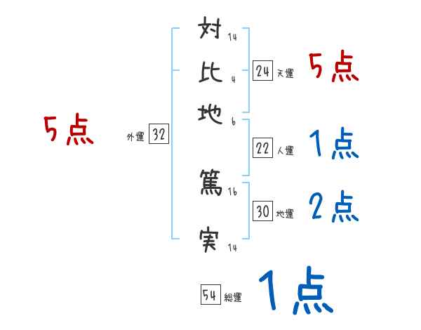 人運![]() | 対比地篤実さんの人運は22画の1つ星!努力することが苦手ないっぽう手先が器用。芸術性にも優れる。 性格や才能などを表す2番目に重要な運勢です。人間関係や協調性、社会的な成功に影響します。主に20歳から50歳ぐらいまでの中年期の運勢を表します。 |