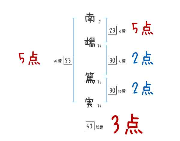 外運![]() | 南端篤実さんの外運は23画の5つ星!想像力に優れ活力がある。一代で成功し名誉を手に入れる。 生活面を象徴する運勢です。外部から受ける影響力を表し、結婚運、家庭運や職場、環境への順応性を表します。 |