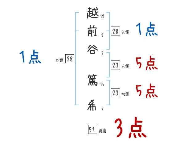 外運![]() | 越前谷篤希さんの外運は28画の1つ星!家庭環境に注意。スポーツで活躍できる能力があるかも。 生活面を象徴する運勢です。外部から受ける影響力を表し、結婚運、家庭運や職場、環境への順応性を表します。 |