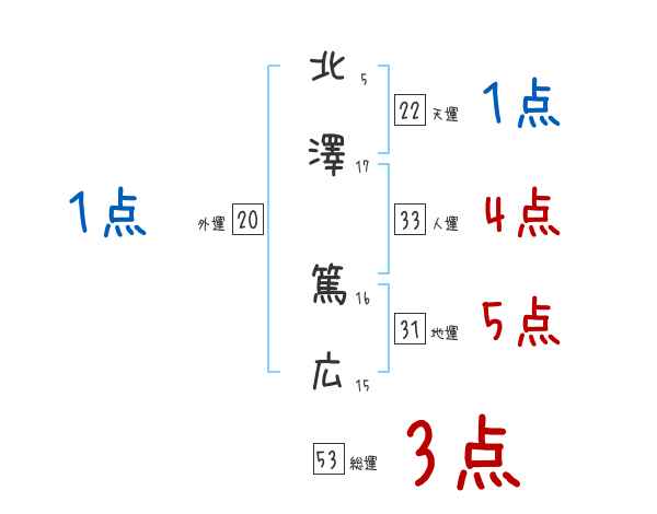 天運![]() | 北澤篤広さんの天運は22画の1つ星!努力することが苦手ないっぽう手先が器用。芸術性にも優れる。 家系が持つ宿命的な運勢を表します。祖先から受け継いだ苗字ですので自分の力が及びません。家柄を象徴します。 |