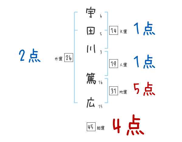 天運![]() | 宇田川篤広さんの天運は14画の1つ星!人に対して優しいがストレスを溜め込みがち。人間関係のトラブルを避けるよう気をつけましょう。 家系が持つ宿命的な運勢を表します。祖先から受け継いだ苗字ですので自分の力が及びません。家柄を象徴します。 |