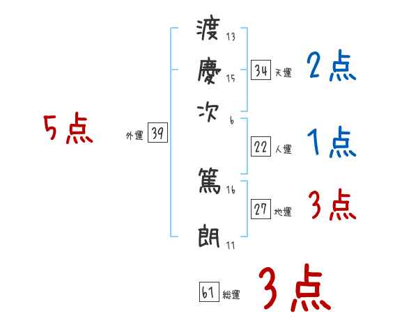 外運![]() | 渡慶次篤朗さんの外運は39画の5つ星!社交性に優れ人望が厚い。人の上に立ち成功する。 生活面を象徴する運勢です。外部から受ける影響力を表し、結婚運、家庭運や職場、環境への順応性を表します。 |