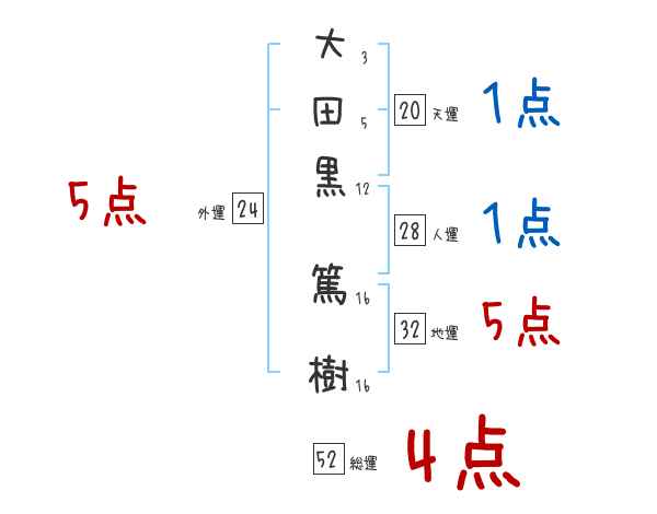外運![]() | 大田黒篤樹さんの外運は24画の5つ星!家庭運が良く順調な人生。金運にも恵まれる。 生活面を象徴する運勢です。外部から受ける影響力を表し、結婚運、家庭運や職場、環境への順応性を表します。 |